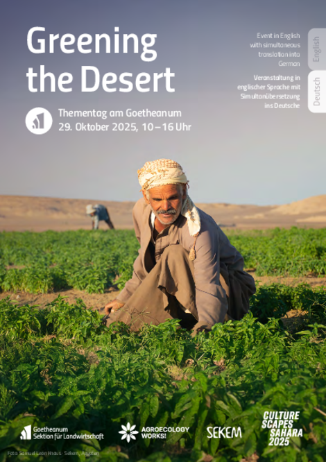 As part of Culturescapes 2025 – Sahara, we present inspiring success stories from desert regions, showing how innovative and biodynamic agriculture is transforming arid lands into fertile soil and creating sustainable livelihoods in some of the world’s most challenging environments. Through a lively interaction between agriculture and the arts, we open up new, future-oriented perspectives.